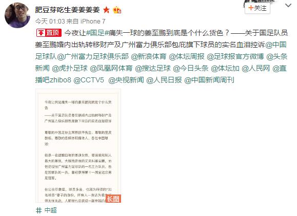 自称是姜至鹏妻子的社交媒体账号,在国足输球后的第一时间发布了“关于国足球员姜至鹏婚内出轨转移财产及广州富力俱乐部包庇旗下球员的实名血泪控诉”的文章。