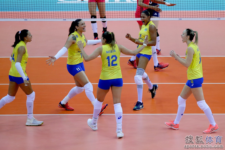 女排3-0巴西开门红 朱婷与队友击掌欢庆