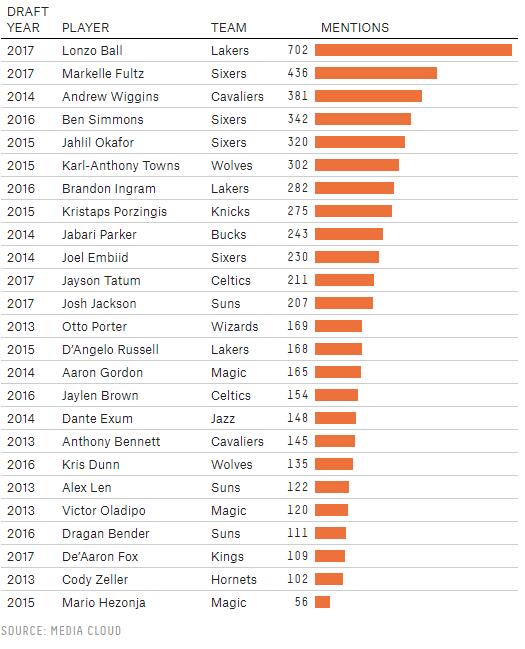 据美媒体报道,湖人新秀后卫郎佐-鲍尔一直保持着稳定的曝光度,从5月2日到7月31日,经过媒体云(一个追踪在线新闻内容的平台),在702个主流新闻中都被提到,这样的程度已经跻身最近五年最顶尖的球星之中。鲍尔的受关注程度,已经远远超过富尔茨与塔图姆之和,要知道这两人一位是今年的状元,另一位是探花。