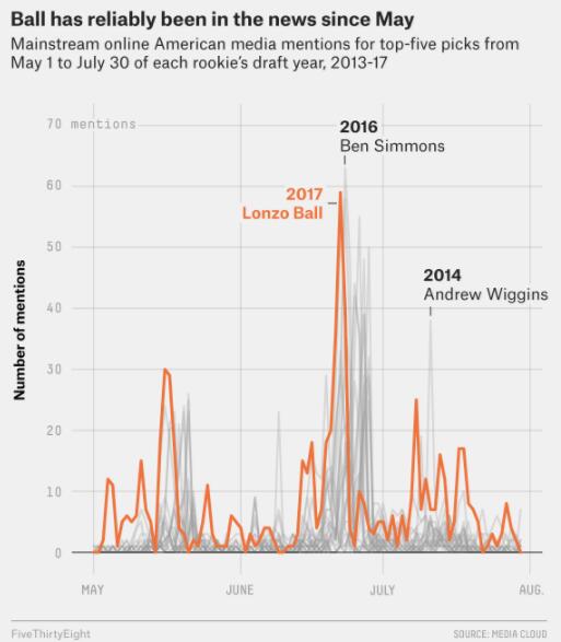 我们分析了这段时间,经过3月底NCAA比赛的影响,五月到七月成为NBA新秀炒作的黄金时段。我们的样本中的球员,在选秀日期临近时都会出现报道激增情况,当然其中也包括鲍尔,不过与其他人不同的是,鲍尔一直保持着很稳定的关注度。