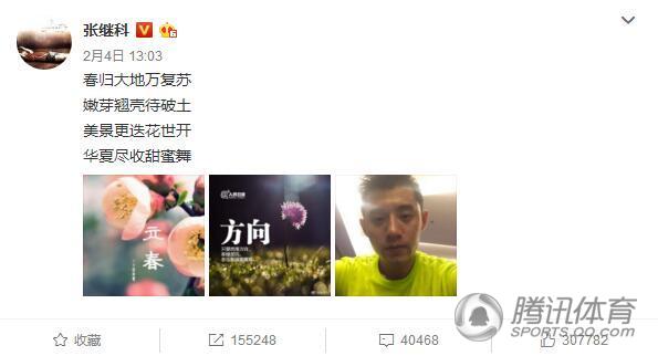 2月4日下午,乒乓球名将张继科也在个人社交平台晒出新作:“春归大地万复苏,嫩芽翘壳待破土。美景更迭花世开,华夏尽收甜蜜舞。”还配上了自己汗流浃背的自拍。这也是张继科与景甜传出绯闻后首次发文,眼尖的网友评论道:“诗里有景甜啊!”景甜不久后就在下面评论:叮咚!您的节气播报员上线。