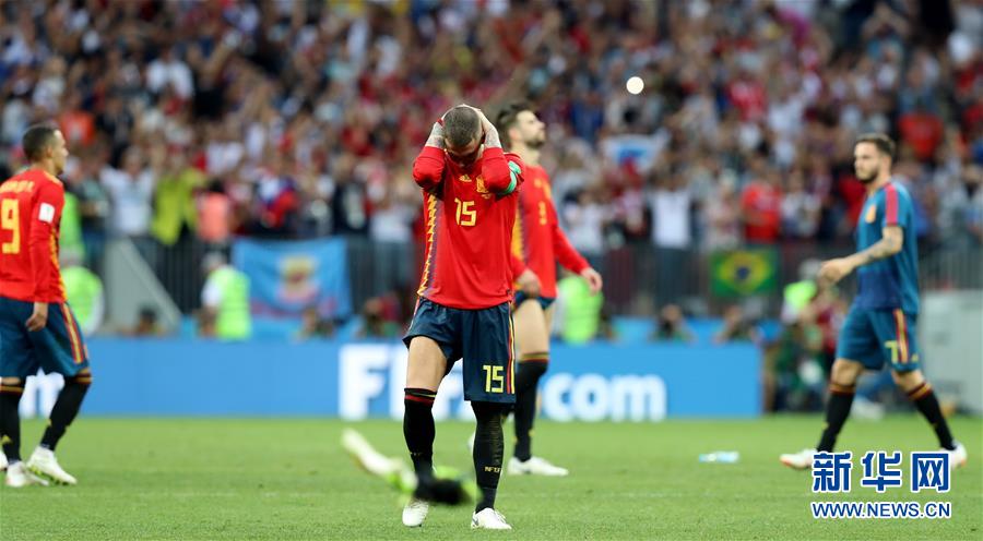 图为7月1日,西班牙队球员拉莫斯(中)在八分之一决赛西班牙队不敌俄罗斯队后沮丧离场。西班牙队与俄罗斯队在120分钟内战成1比1平。经过点球大战,西班牙队以总比分4比5不敌俄罗斯队,无缘八强。新华社记者杨磊摄